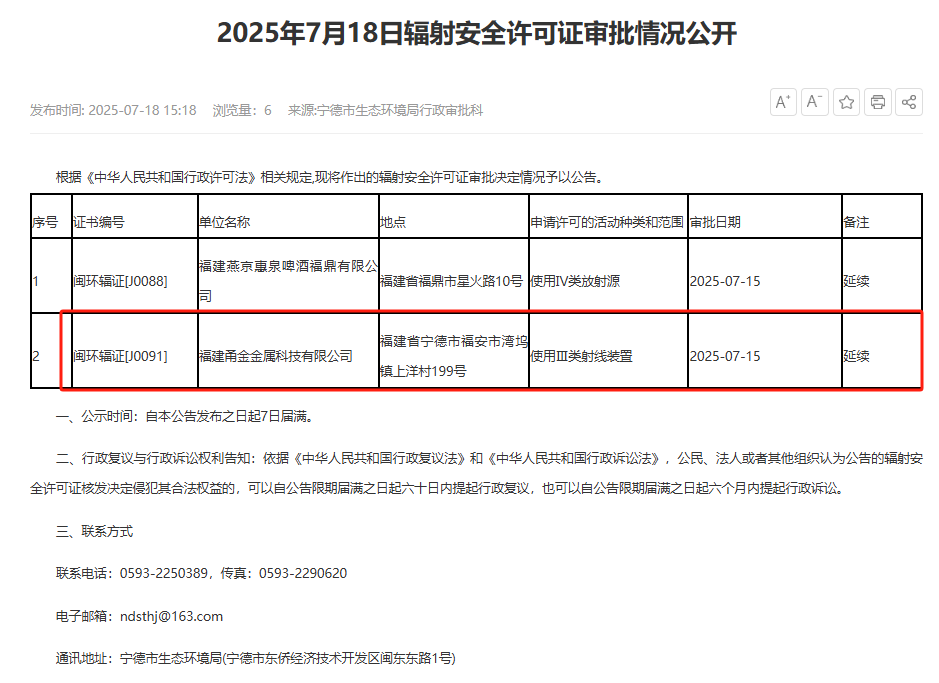 據(jù)顯示,福建甬金金屬科技有限公司使用Ⅲ類射線裝置輻射安全許可證于2025年7月15日獲審批通過(guò)。