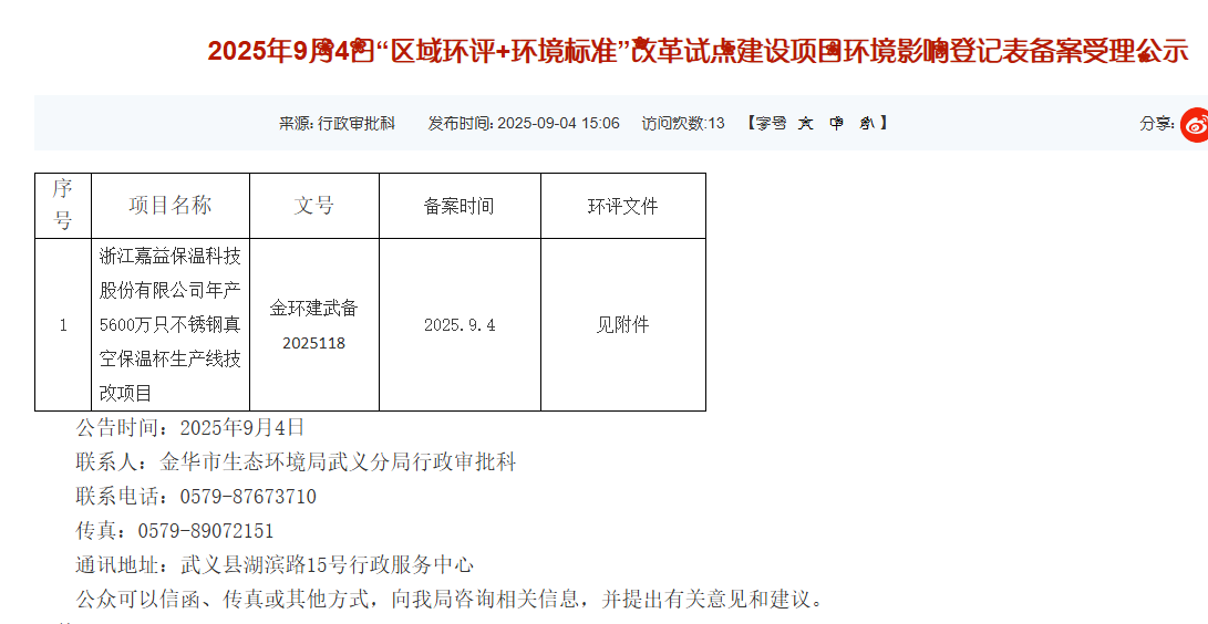 2025年9月4日,金華市生態(tài)環(huán)境局受理武義分局浙江嘉益保溫科技股份有限公司年產(chǎn)5600萬只不銹鋼真空保溫杯生產(chǎn)線技改項目環(huán)境影響評價報告表并對外進行公示。