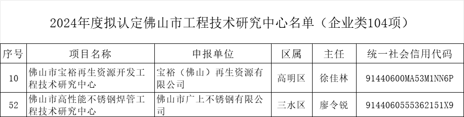 據名單信息顯示,佛山市寶裕再生資源開發工程技術研究中心、佛山市高性能不銹鋼焊管工程技術研究中心均入選。